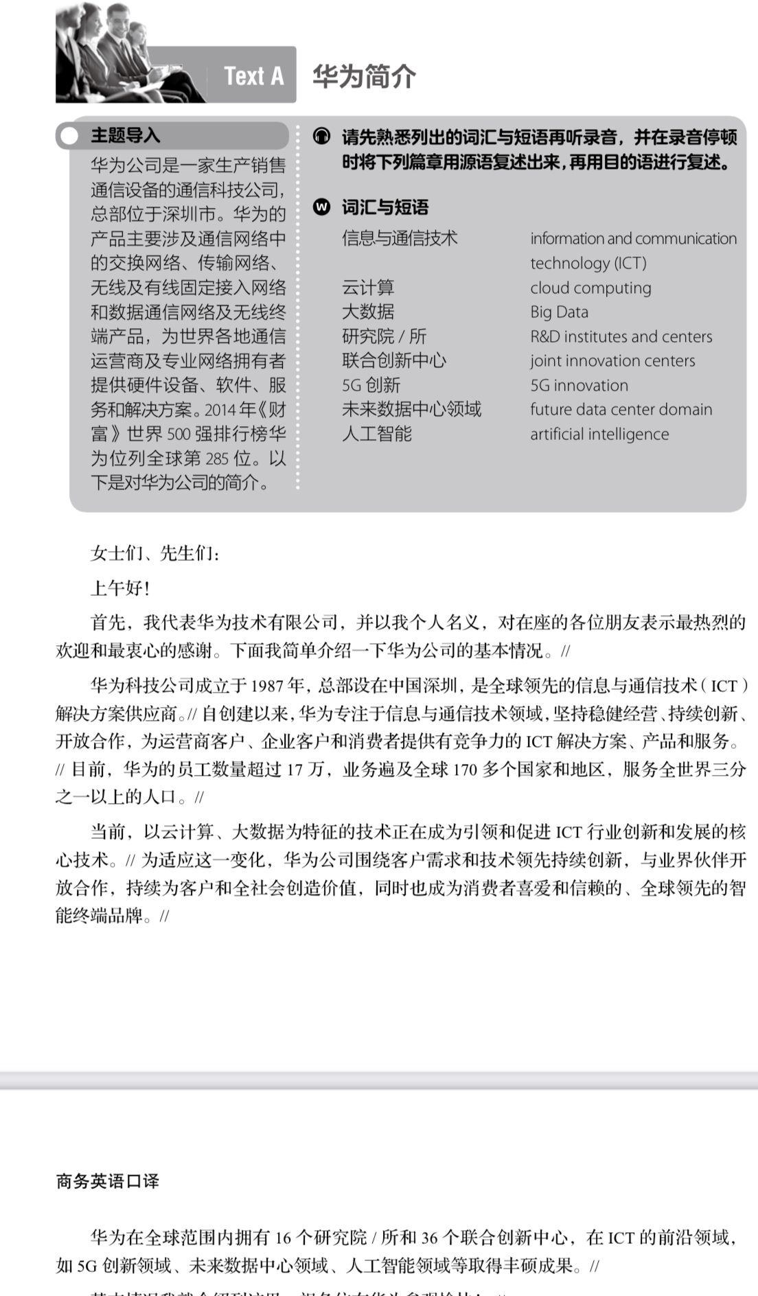 - Tecniche di interpretazione: Verranno fornite agli studenti nozioni per l'apprendimento dell'interpretazione di trattativa commerciale, indirizzandosi verso i fondamenti dell'interpretazione consecutiva che riguarderanno in modo più particolare il secondo modulo dell'esame. Sarà data attenzione alla comprensione del messaggio, alla sintesi e alla restituzione nella lingua di destinazione.