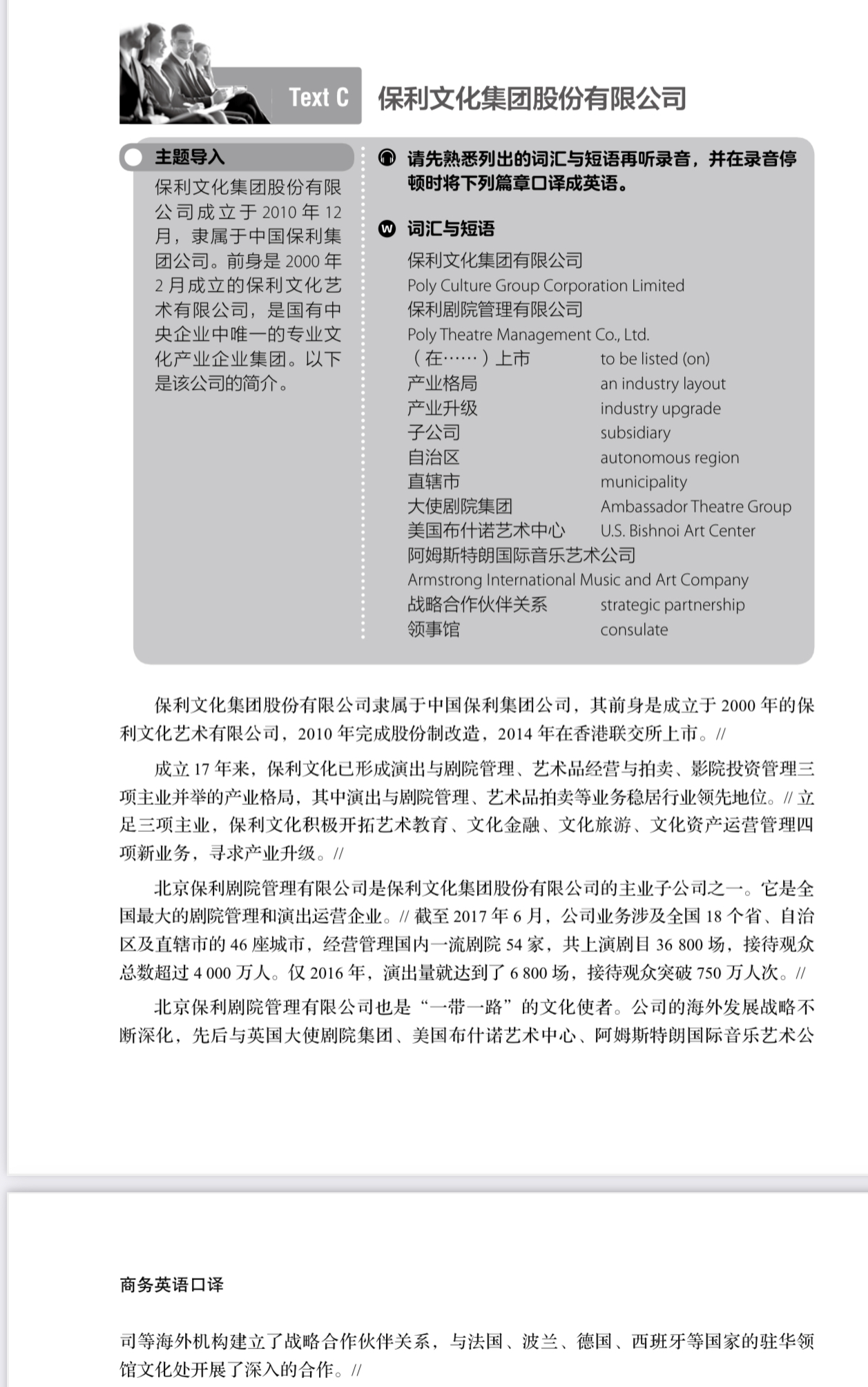 - Tecniche di interpretazione: Attraverso esercizi di riformulazione, parafrasi e riassunti con e senza presa di appunti, si fornirà agli studenti una panoramica delle tecniche dapprima generale poi più focalizzata sulla diversa tipologia di interpretazione. Gli studenti dovranno inoltre imparare a gestire il linguaggio del corpo, oltre che gli imprevisti di una situazione di trattativa commerciale.
