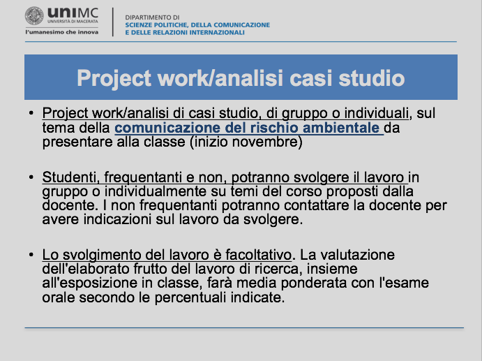 In particolare, per quest'ultimo punto, durante il corso sarà proposto un lavoro di ricerca o analisi di casi di studio legato alla comunicazione del rischio ambientale e per la salute, per veri?care sia la conoscenza degli argomenti trattati a lezione e la capacità critica degli studenti, sia la capacità di analisi/gestione dell'attività di comunicazione pubblica.